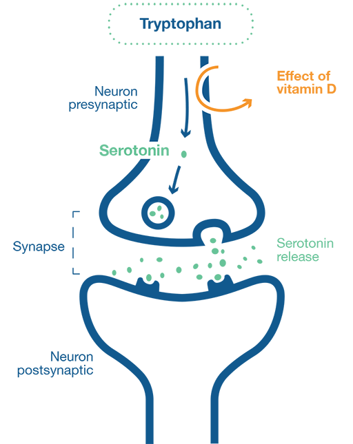 نشان داده شده است که ویتامین D از طریق اثر تنظیم کننده سروتونین بر سلامت روان تأثیر می گذارد: به نظر می رسد به فعال کردن تبدیل از تریپتوفان، یک اسید آمینه ضروری، به سروتونین کمک می کند. با افزایش سن، افراد تمایل بیشتری به ماندن در خانه دارند و با قرار گرفتن در معرض نور خورشید ویتامین D کمتری تولید می کنند. کمبود سروتونین ممکن است منجر به افسردگی و کاهش سلامت روان شود. علاوه بر این، یک متاآنالیز تأیید کرد که مکمل ویتامین D عملکردهای شناختی، به ویژه عملکردهای اجرایی را بهبود می بخشد.